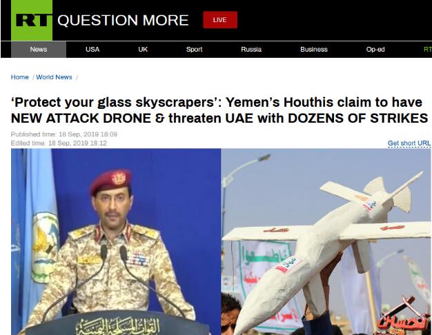 【环球网报道 记者 王博雅琪】“如果阿联酋想要保护他们的玻璃摩天大楼,就应该停止参与(对也门的)侵略。”在宣称对14日无人机袭击沙特两处石油设施负责后,也门胡塞武装18日威胁称,要使用新型无人机袭击阿联酋及其繁华的金融中心阿布扎比。