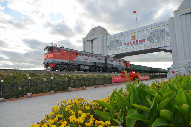 2018年9月4日,一列來自俄羅斯方向的火車駛過中國內蒙古滿洲裏國門。(新華社記者鄒予攝)