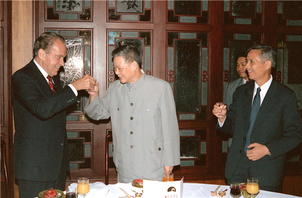 1985年9月8日,叶选平(中)在广州宴请美国前总统理查德·尼克森。新华社