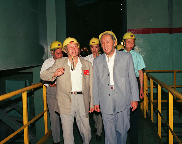 1991年6 月28日,葉選平(左)參觀首鋼。新華社