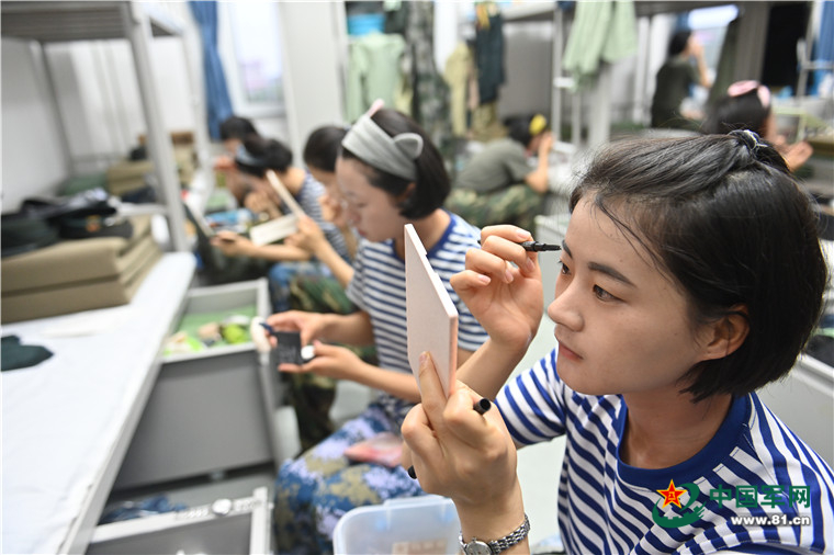 女兵快速化妝補妝。閱兵訓練期間,不管她們以前是否化妝,都需要學會這項技能。方隊統一為隊員采購了性價比高的護扶品、防曬霜和面膜。