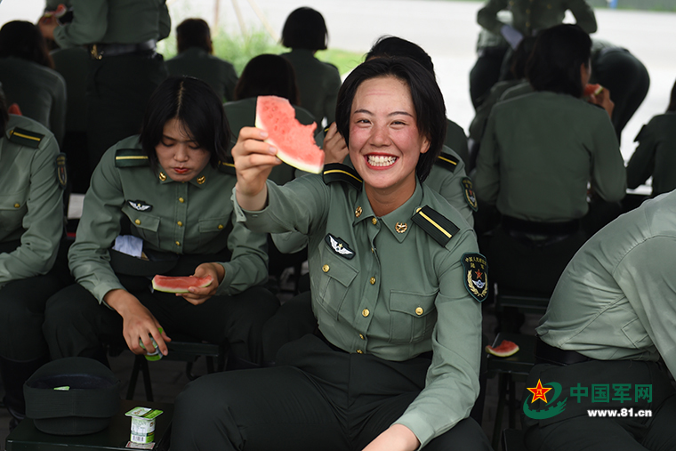 訓練休息間隙加送營養餐。女兵隊員吃到喜愛的水果、酸奶、餅幹,眉開眼笑。