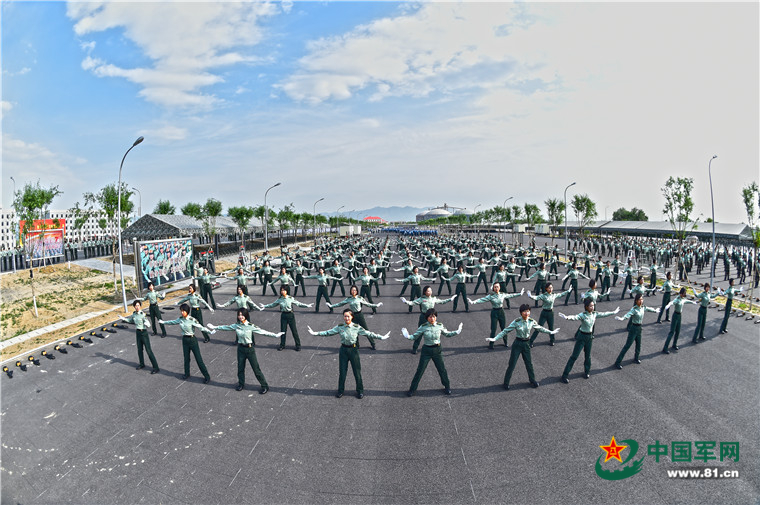 下午訓練前,隊員們跳起歡快的健身操熱身。方隊堅持科學施訓,有效預防訓練傷的發生。
