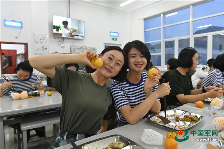 女兵換下濕透的衣服陸續到食堂吃午飯。炊事班科學制訂營養食譜,粗細混合、幹稀互補、葷素搭配,菜品一周不重樣。