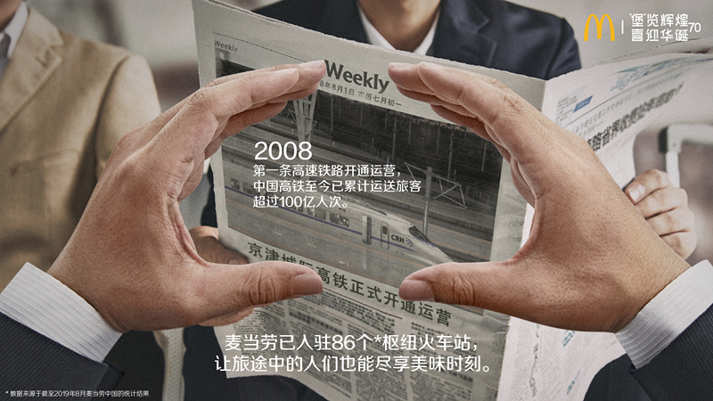 4.便捷出行,美味随心:2008年,中国第一条高速铁路 -- 京津城际铁路正式开通。高铁不仅改变了人们的出行方式,更推动了区域经济发展。麦当劳已入驻86个枢纽火车站,为旅客提供便捷美味。