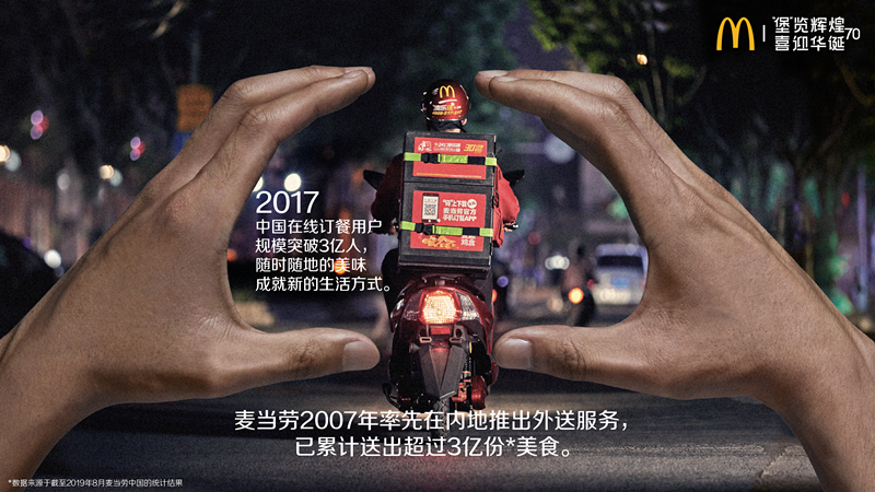 6.外送生活,方便美味:2017年,中国在线订餐用户突破3亿人,外卖已成为一种生活方式。麦当劳中国于2007年率先推出外送服务。截至2019年8月,麦当劳累计送出超过三亿份餐点,让消费者在不同场景下享受高品质的食品。