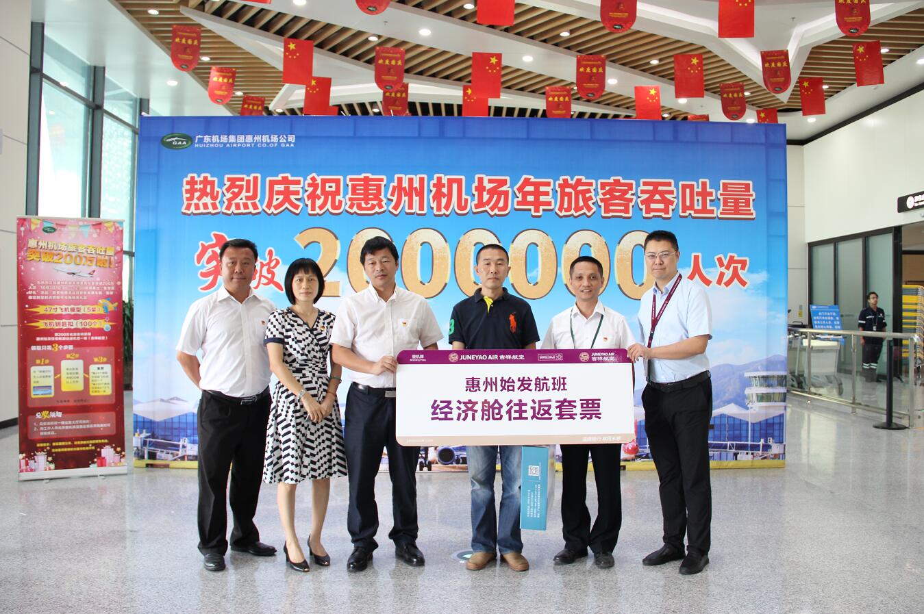 当天上午10时许,乘坐吉祥航空HO1016航班从惠州飞往杭州的旅客李先生,成为惠州机场的第200万名幸运旅客。惠州机场公司党委书记杨勇和惠州市港口航空铁路事务中心主任陈宇文共同为该幸运旅客送上了由吉祥航空提供的惠州出发任意航点往返经济舱免票一套和飞机模型,现场还开展了旅客参与“朋友圈集赞”送纪念品互动活动。吉祥航空惠州营业部总经理唐磊、机场员工及旅客共同见证了这一重要时刻。