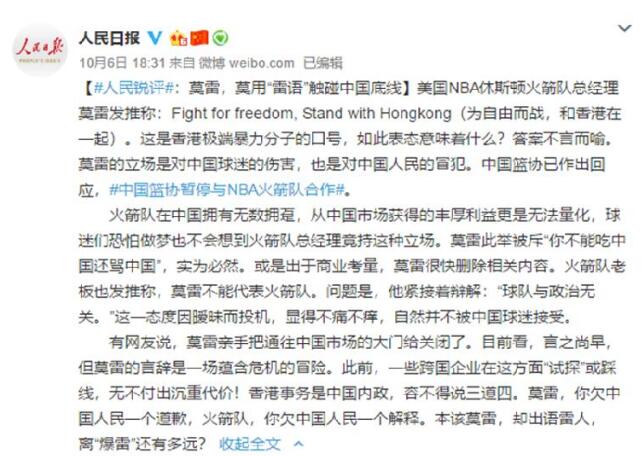 10月5日,球队总经理莫雷在推特上公开转发涉及“港独”言论,不仅伤害了中国球迷,也是对中国人民的冒犯。6日,人民日报官博评论:火箭队在中国拥有无数拥趸,从中国市场获得的丰厚利益更是无法量化,球迷们恐怕做梦也不会想到火箭队总经理竟持这种立场。莫雷此举被斥“你不能吃中国还骂中国”,实为必然。