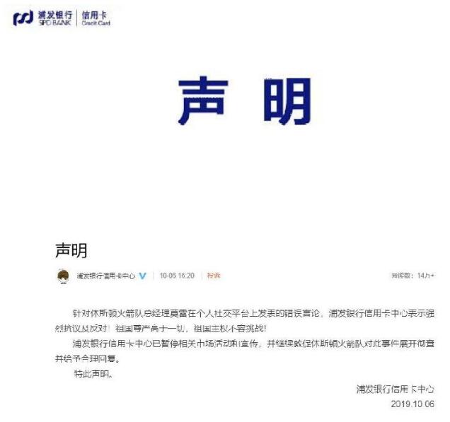 火箭队中国赞助之一的浦发银行声明