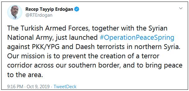 话音刚落,埃尔多安在推特上宣布,土耳其正规军已经与土耳其支持的叙利亚反对派武装“叙利亚国民军”一道,发起代号为“和平喷泉”的军事行动。
