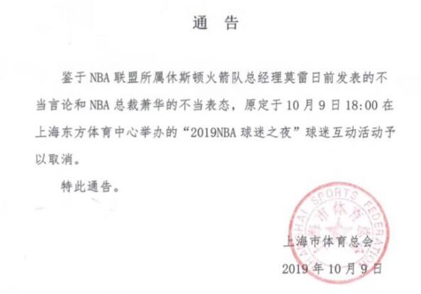 由于一支球队总经理的不当言论,整个NBA被拖下水。最新消息显示,NBA总裁连夜来华也无回天之力,上海体育总会已经发布了取消“2019NBA球迷之夜”活动的通知。