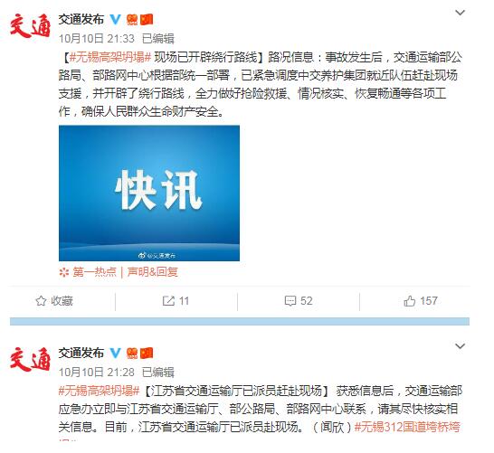 此外,据中国交通报官方微博@交通发布 消息,事故发生后,江苏省交通运输厅已派员赴现场。交通运输部公路局、部路网中心根据部统一部署,已紧急调度中交养护集团就近队伍赶赴现场支援,并开辟了绕行路线,全力做好抢险救援、情况核实、恢复畅通等各项工作。
