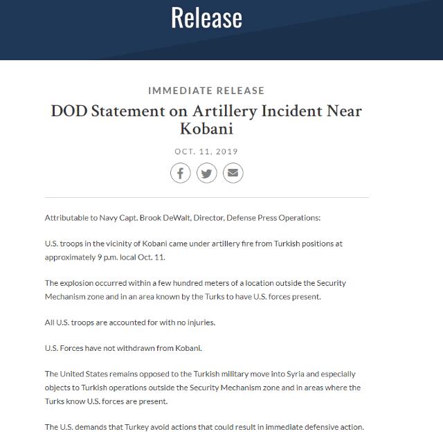 据五角大楼声明介绍,炮击发生在当地时间11日晚间9时许,地点位于(叙利亚北部边境城市)科巴尼附近。声明称,爆炸发生在安全机制区外美军哨所数百米之内,并且是土耳其已知有美军驻扎的地区。