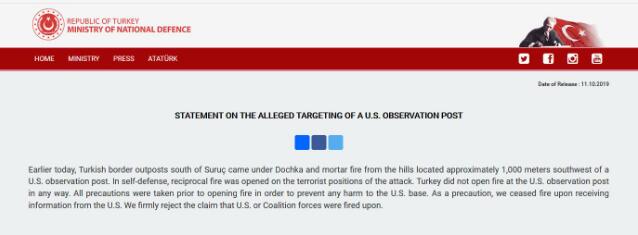 土国防部在声明中称,“土耳其没有以任何方式向美国观察哨开火。为防止对美国基地造成任何伤害,在开火前有采取预防措施。”“作为其中一个预防措施,我们在收到来自美国的信息后立即停止了射击,我们坚决反对美军或联军遭到袭击的说法。”
