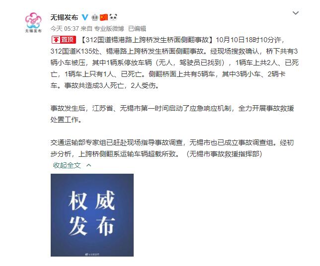 10月10日18时10分许,江苏省无锡市312国道K135处、锡港路上跨桥发生桥面侧翻事故。经现场搜救确认,事故造成3人死亡,2人受伤。