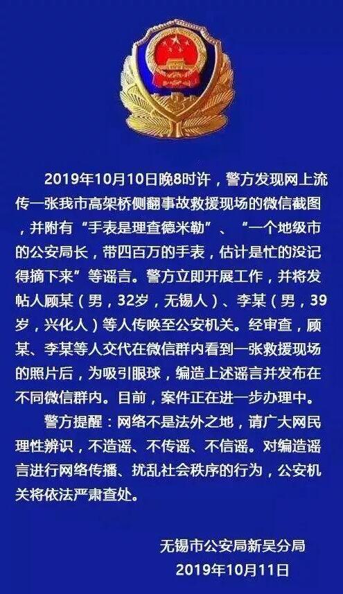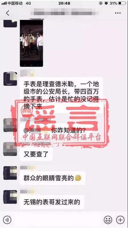 10日晚8时许,在救援工作正紧张进行时,网上流传出一张事故救援现场的微信截图,并附有“手表是理查德米勒”、“一个地级市的公安局长,带四百万的手表,估计是忙的没记得摘下来”等谣言。