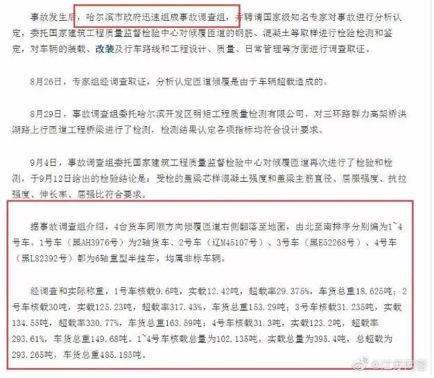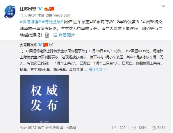 11日9时,江苏网警在官方微博做出辟谣:网传“四车总重400余吨”系2012年哈尔滨“8?24”高架桥交通事故一事调查结论,与本次无锡事故无关。