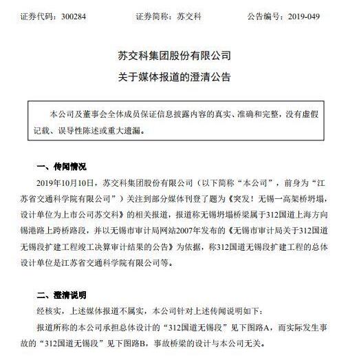 部分媒体刊登了题为《突发!无锡一高架桥坍塌,设计单位为上市公司苏交科》的相关报道。11日早间,苏交科在深圳证券交易所发布澄清公告称,经核实,报道所称事故桥梁的设计与公司无关。公司将持续关注和跟进前述媒体报道相关事宜,将根据事态的发展,保留采取进一步法律措施的权利,维护公司正当权益。