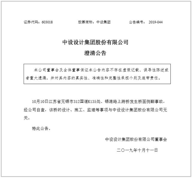 随后,中设设计集团在上海证券交易所发布澄清公告称,10日江苏省无锡市312国道K135处、锡港路上跨桥发生桥面侧翻事故,经该公司自查,该桥的设计、施工、监理等事项与中设设计集团股份有限公司无关。