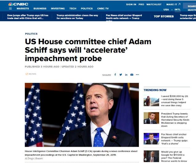 【环球网报道 见习记者 李桐佑】据美国消费者新闻与商业频道(CNBC)12日消息,美国众议院情报委员会主席亚当·希夫11日在写给众议院议员的一封信中表示,将“加速”对特朗普的弹劾调查。