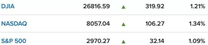 昨夜美股盘中,受中美贸易利好消息提振投资者的信心,三大股指收涨,其中道琼斯工业平均指数盘中一度上涨超500点。截至北京时间10月12日04:00收盘,道琼斯工业平均指数涨1.21%,报26816.59点;纳斯达克综合指数涨1.34%,报8057.04点;标普500指数涨1.09%,报2970.27点。