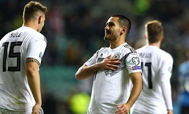 同日,客场作战的德国队开局不利,后卫埃姆雷·詹第14分钟时就因放倒利瓦克被红牌罚下。不过,曼城球员京多安第51和第57分钟连下两城,维尔纳第71分钟再添一球,德国队3:0完胜爱沙尼亚,拿下关键3分。
