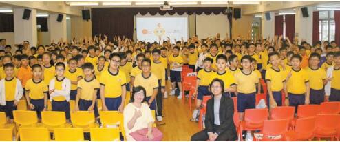 虛擬主播系統在學校大受歡迎,學生利用該系統拍攝動畫。圖為李嘉俊與保良局香港道 教聯合會圓玄小學師生一起。
