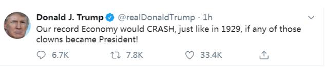 随后,他再发了一条推文讽刺民主党人,“如果这些小丑中的任何一位当选总统,我们创纪录的经济将会崩溃,就像在1929年一样!”1929年10月24日,美股暴跌,美国爆发了资本主义历史上最大的一次经济危机,引发世界范围内的经济大衰退。