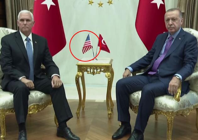 值得注意的是,在彭斯和埃尔多安会晤的办公室,土耳其方面只放了一面美国小国旗。而两人身后的大旗帜,则都是土耳其国旗。