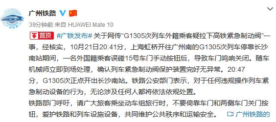 中国铁路广州局集团有限公司官方微博23日消息,关于网传“G1305次列车外籍乘客疑拉下高铁紧急制动阀”一事,经核实,10月21日20:41分,上海虹桥开往广州南的G1305次列车停靠长沙南站期间,一名外国籍乘客误碰15号车门手动按钮后,导致车门鸣响关闭。随车机械师立即到场处理,确认列车紧急制动阀保护装置完好无异常。20:47分,G1305次正点开出长沙南站。铁路公安部门表示,对于任何违规操作列车紧急制动设备的行为,无论涉及任何人都将依法依规处置。