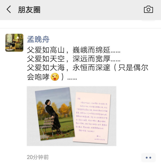 這條朋友圈還附上了一張孟晚舟的照片和署名“豬兒”(孟晚舟)致“老爸”的信。