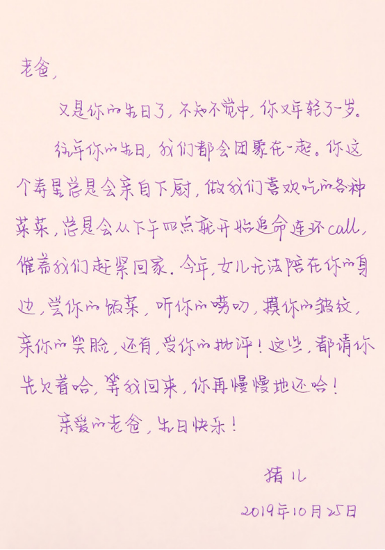 孟晚舟在生日賀信中說,往年他的生日他們“都會團聚在一起”,但遺憾“今年無法陪在他的身邊”。“都請你欠著,等我回來。親愛的老爸,生日快樂!”