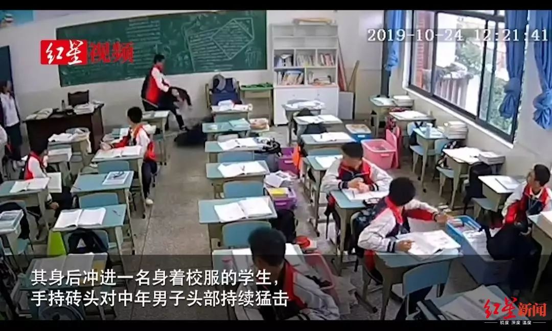 10月25日,一段視頻正在網上流傳,視頻中顯示在一間教室裏,一名身穿便服的男子走進教室後,一名身穿校服模樣的少年用磚頭從其背後多次擊打其頭部,致使其頭部流血,該男子捂著頭部倒地後,這名穿著校服模樣的少年欲再次上前擊打,但被教室裏其他學生摟抱住,被砸傷男子在牆上留下的血跡清晰可見。