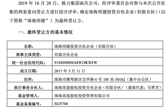 10月28日晚间,格力电器发布公告称,格力集团函告公司,经评审委员会对参与本次公开征集的两家意向受让方进行综合评审,确定珠海明骏投资合伙企业(有限合伙)(以下简称“珠海明骏”)为最终受让方。