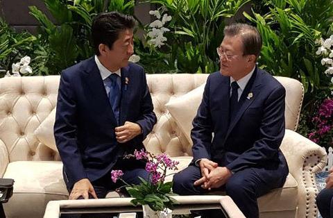 而在昨天(3日)出席東盟系列峰會合影時,文在寅與安倍也僅僅是握手示意,沒有其他交談。
