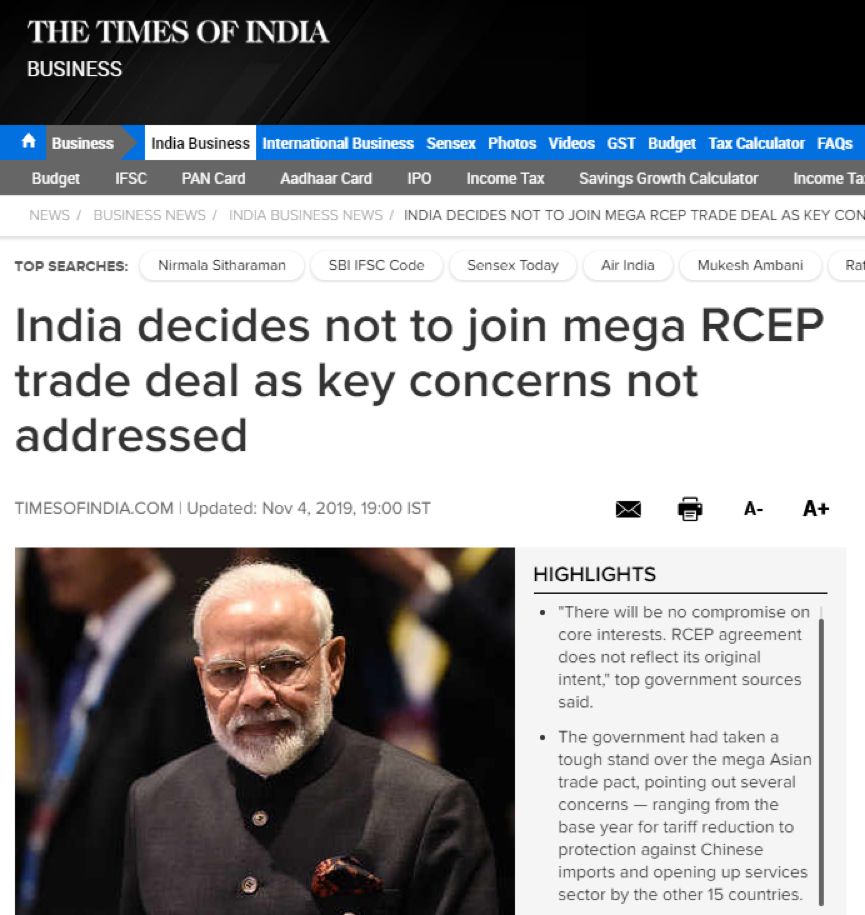 “RCEP未能展現出其設立的初衷,我們也不會因此損害印度的核心利益”,一個來自印度政府高層的消息稱。該信源同時告訴《印度時報》,印度的立場是該協議既要務實,也要保護到印度窮人的利益,還要能讓印度的服務業獲利。