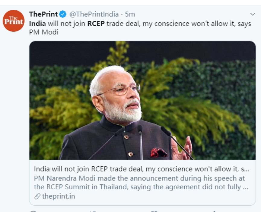 但印度總理莫迪認為這個協議未能照顧到印度包括農民、商人、工人、消費者以及各行業的利益。因此,在正在泰國曼穀舉行的RCEP第三次領導人會議上,他宣布印度不會加入該協議。
