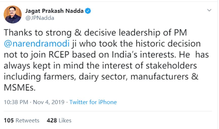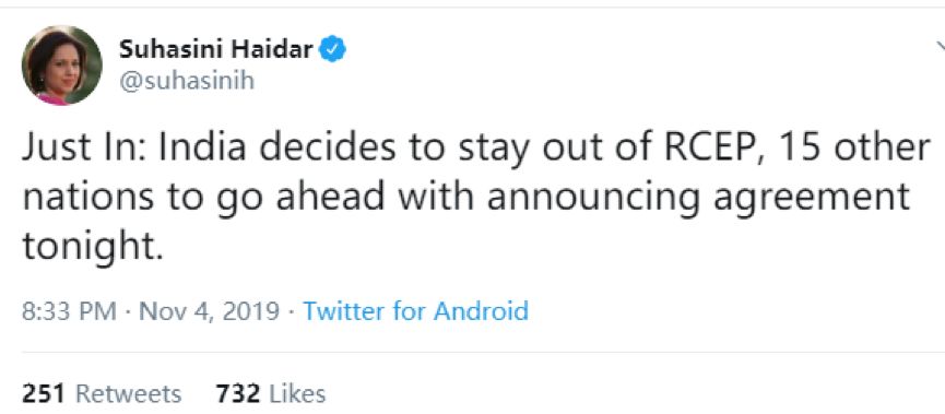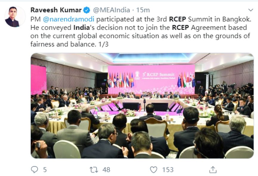 根據印度多家媒體報道,以及印度外交部發言人的確認,印度總理莫迪已經宣布,該協定目前的談判內容不利於印度的國家利益,因此印度不會加入這一協定。