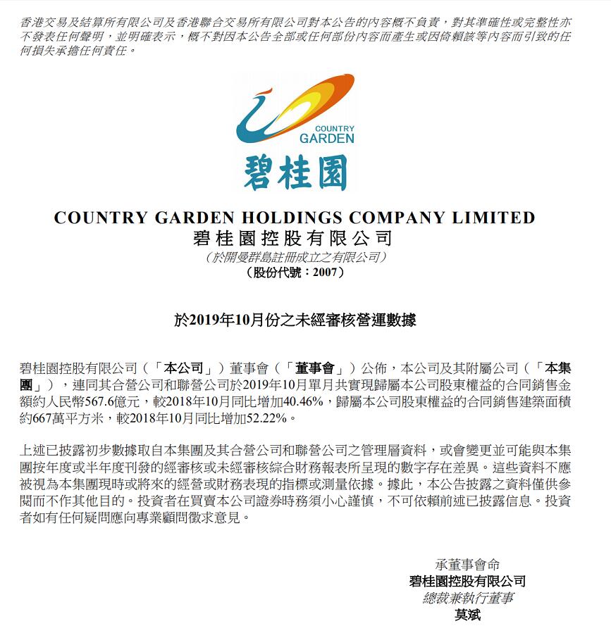 【香港商报网讯】记者黄裕勇报道:11月5日晚间,碧桂园(02007.HK)披露10月销售业绩显示,碧桂园及其附属公司、连同合营公司和联营公司于今年10月共实现归属公司股东权益的合同销售金额约567.6亿元,同比增加40.46%,归属公司股东权益的合同销售建筑面积约667万平方米,同比增加52.22%。