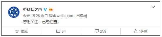 中国科学院官方微博@中科院之声 随后发布微博“感谢关注,已经在查。”