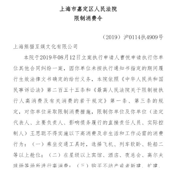 上述限制消费令显示,法院于2019年08月12日立案执行申请人曹悦申请执行上海熊猫互娱文化有限公司其他合同纠纷一案,因熊猫互娱未按执行通知书指定的期间履行生效法律文书确定的给付义务,被采取限制消费措施,限制其法定代表人、主要负责人、影响债务履行的直接责任人员、实际控制人王思聪不得实施高消费及非生活和工作必需的消费行为。