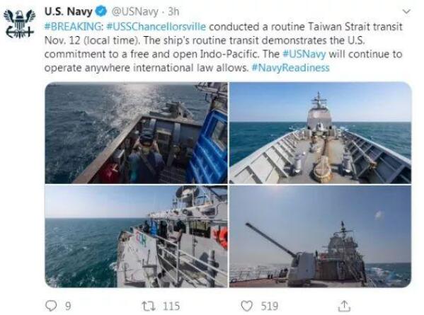 图注:美国海军在社交媒体推特上发文,称“钱斯勒斯维尔”号导弹巡洋舰当地时间11月12日穿越台湾海峡。