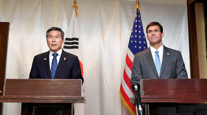 11月17日,韩国国防部长官郑景斗(左)和美国国防部长马克·埃斯珀在泰国举行会谈。双方称,推迟原定于本月内进行的空中联合军事演习。