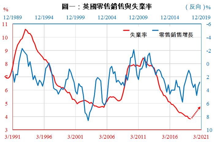 主要發達經濟體近十年側重於第三產業,而勞動人口職業以服務業為主,當中零售銷售表現較影響企業盈利及聘請狀況,再而反映在失業率上。因此,圖一可見,英國零售銷售按年增長與失業率走勢有着密切反比關係,前者領先後者約5季。英國零售銷售增長在2016年開始反覆放緩。按紅箭預示,估計英國失業率,料在未來5季回升。