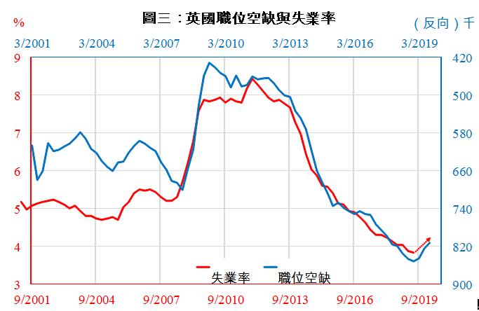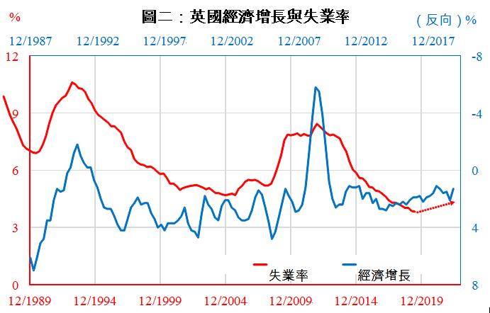 綜合四圖可見,英國失業率目前應已見底,然而在未來兩年持續回升,但速度相對溫和。由是觀之,雖然英國將面對脫歐過渡期,但以各前瞻指標來看,就業前景雖然轉弱但未至於嚴重萎縮。