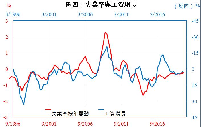 再看英國職位空缺。圖三顯示其走勢與失業率反向,前者領先後者半年。職位空缺自金融海嘯後一直上升,數量一度更超出金融海嘯前的平均水平。不過今年初開始略回落,因此失業率在未來兩季應回升。