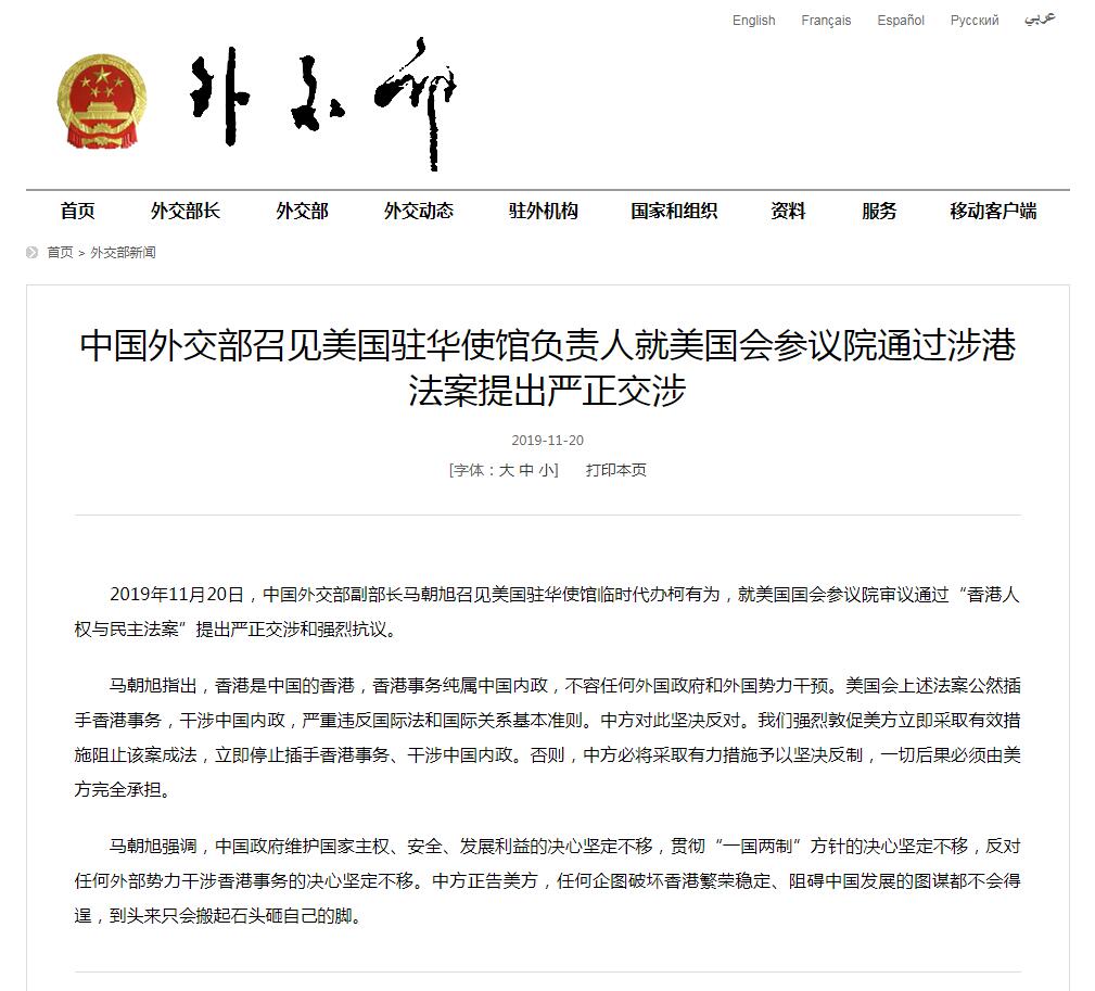 【香港商報網訊】據外交部官網消息,2019年11月20日,中國外交部副部長馬朝旭召見美國駐華使館臨時代辦柯有為,就美國國會參議院審議通過“香港人權與民主法案”提出嚴正交涉和強烈抗議。