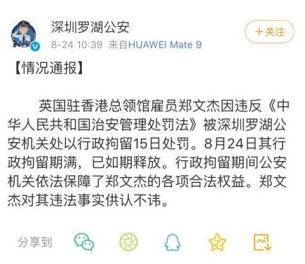 关于你刚才提到英国外交大臣对于此事的最新表态,我目前还没有看到,需要去了解核实。但我刚才介绍情况时已经说了,今年8月,深圳罗湖公安机关已经对外作过通报,其中明确指出,郑文杰在被行政拘留期间,公安机关依法保障了郑文杰的各项合法权益。郑文杰也对其违法事实供认不讳。