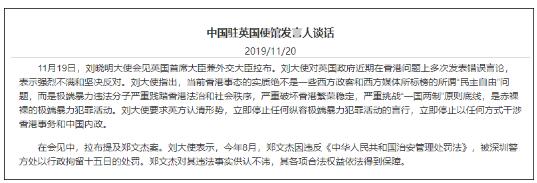 刘大使对英国政府近期在香港问题上多次发表错误言论,表示强烈不满和坚决反对。刘大使指出,当前香港事态的实质绝不是一些西方政客和西方媒体所标榜的所谓“民主自由”问题,而是极端暴力违法分子严重践踏香港法治和社会秩序,严重破坏香港繁荣稳定,严重挑战“一国两制”原则底线,是赤裸裸的极端暴力犯罪活动。