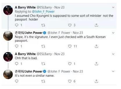 而面对一些人提出的上图中红圈里的那个部分是不是护照“签发机关”的名称,John Power则表示他已经和有真正韩国护照的人核实过了,那个地方写的就是持照人的韩国名字。
